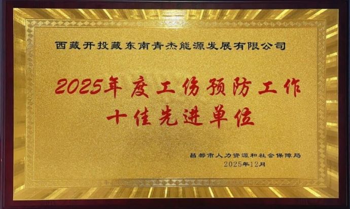 12月9日,昌都市人力资源和社会保障局授予西藏开投藏东南青杰能源公司“2025年度工伤预防工作十佳先进单位”称号,以表彰公司在工伤预防与安全管理方面取得的扎实成效。