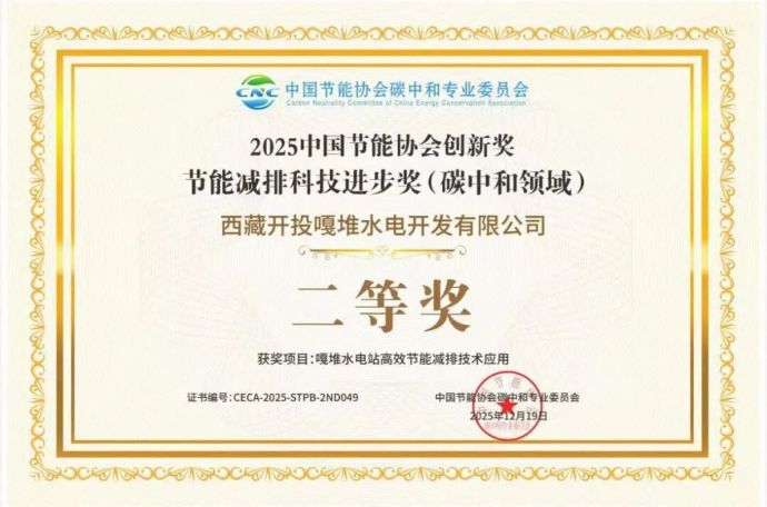 近日,中国节能协会2025年度创新奖获奖名单正式公布,西藏开投嘎堆水电公司申报的“嘎堆水电站高效节能减排技术应用”项目荣获“节能减排科技进步奖(碳中和领域) 二等奖”。