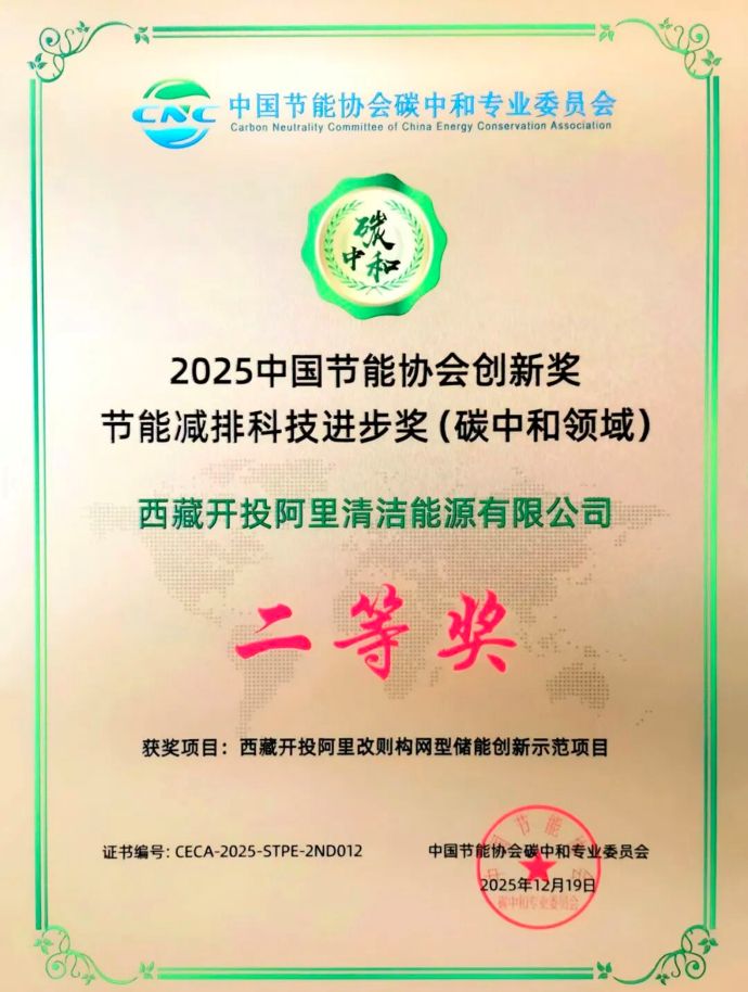 近日,由中国质量认证中心、中国节能协会碳中和专业委员会联合颁发的2025中国节能协会创新奖名单揭晓,由西藏开投阿里清洁能源公司投资建设的阿里改则构网型储能创新示范项目获“节能减排科技进步奖(碳中和领域)二等奖”。