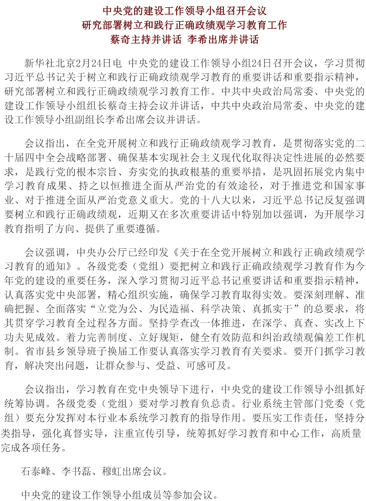 中央党的建设工作领导小组召开会议研究部署树立和践行正确政绩观学习教育工作