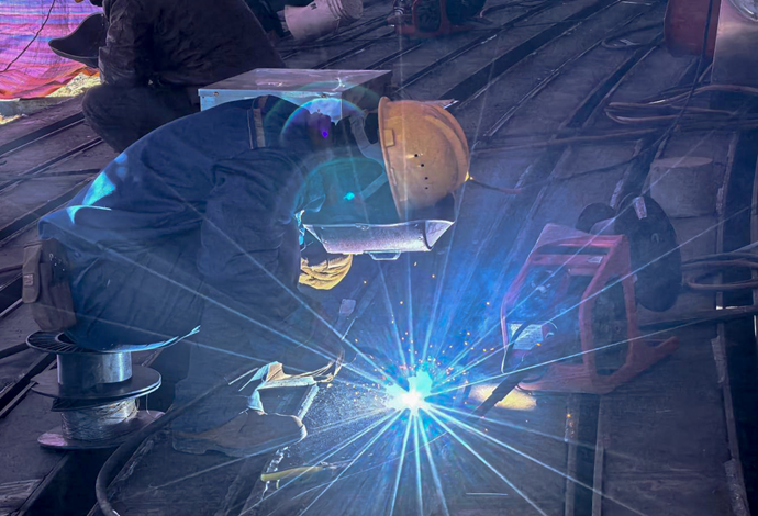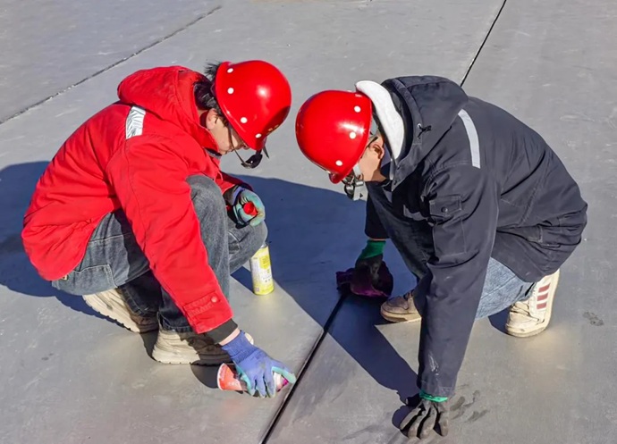 现场工人进行金属板材接缝处理。