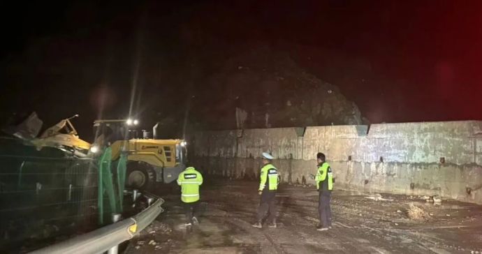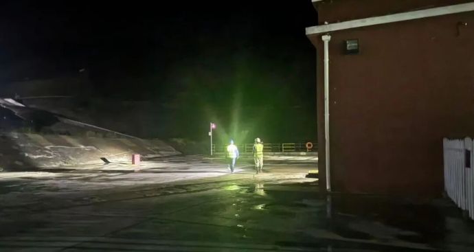 现场工作人员深夜进行主汛期库周公路清通作业。